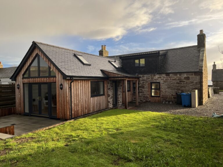 This house, set is Helmsdale is a traditional property that had been extended with a small flat roofed kitchen. The project involved removing the existing kitchen and boiler house extensions and replacing them with a new open plan kitchen dining and seating area, and new utility room.