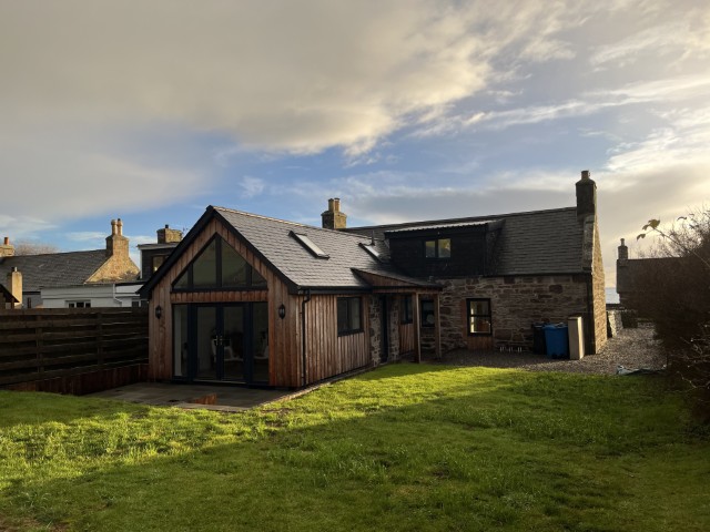 The existing house has been stripped out, insulated and redecorated. The rear kitchen extension was removed and a new extension added to provide a new kitchen with sitting area, utility room and bathroom. The extension now relates and connects to the garden giving views into the Dornoch roofscape.