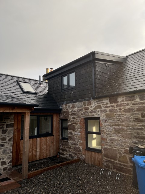 Completed in summer 2018, this contemporary extension has brought light and life back into the house, creating a new kitchen, dining and sitting area with covered sitting area, all overlooking the private garden. Exposed Douglas Fir roof beams and polished concrete floor provide a contrast to the repointed stonework. The works also included a crafted kitchen top light by a large roof window.